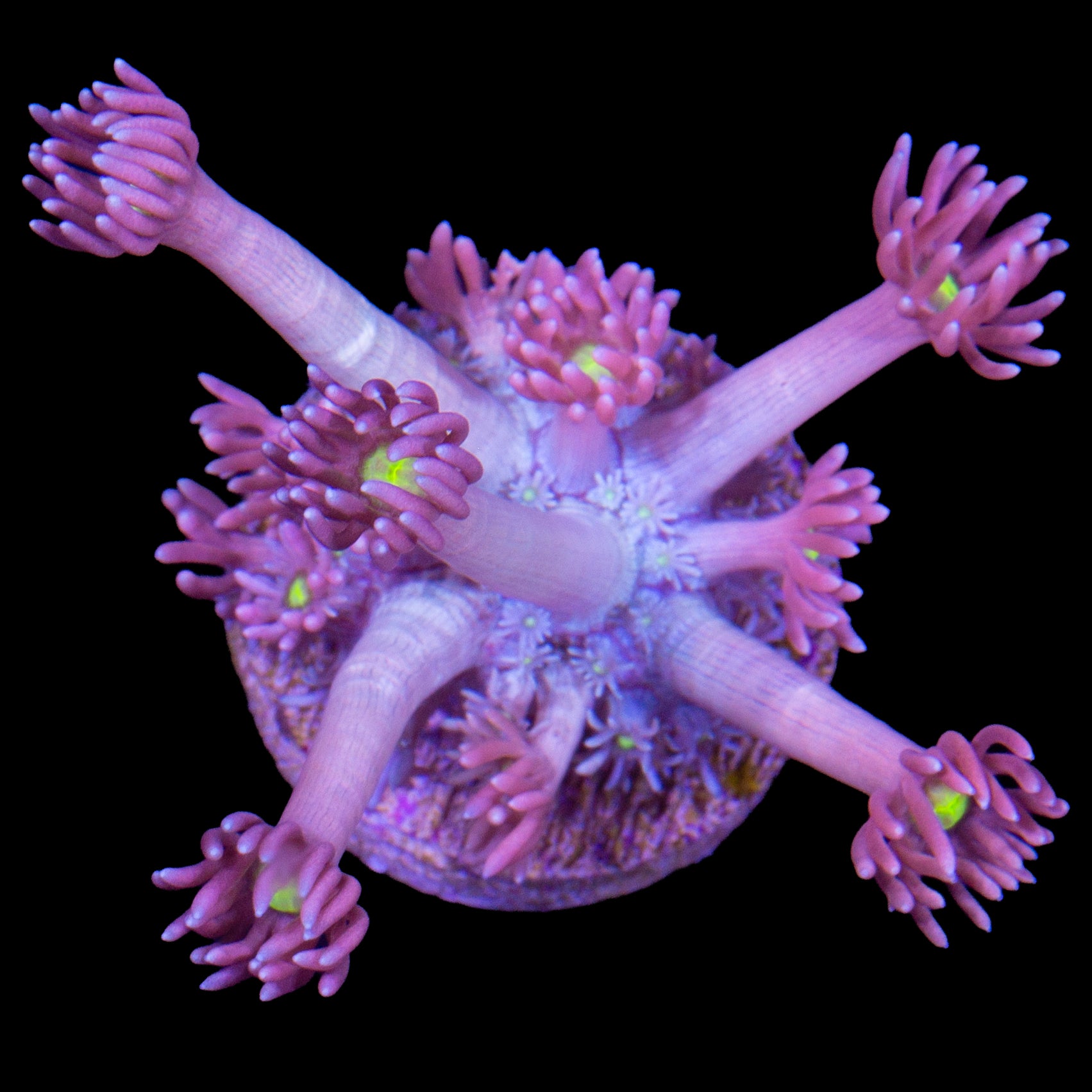 Vivid's Yellow Eye Pink Goniopora Coral will bring a burst of color and movement to any reef aquarium. They can sting nearby corals so leave a few inches between Goniopora and other corals. Clownfish will often host Goniopora Corals if there is no Anemone available. Goniopora Corals make a good choice for reefs that house Angelfish since Angels rarely bother this species.